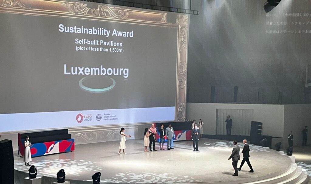 実は、本パビリオンのもう一つの目玉は建築における循環経済のパイロットプロジェクトという側面です。「サーキュラー・バイ・デザイン」のコンセプトを掲げ、設計から解体後の実際の建築資材再利用まで、徹底して循環性達成を目指してきました。万博閉幕直前に行われた、博覧会国際事務局(BIE)賞表彰式にて、「建築・景観」「展示デザイン」「テーマ解釈」「サステナビリティ」の 4 部門のうち、ルクセンブルクパビリオンがサステナビリティ賞に輝きました(※敷地面積 1500 ㎡未満、独自建設パビリオンの部門)。デザインの実現から各部材の再利用プロジェクトまで、循環経済達成に一緒に取り組んで下さったパートナーのご協力のおかげです。