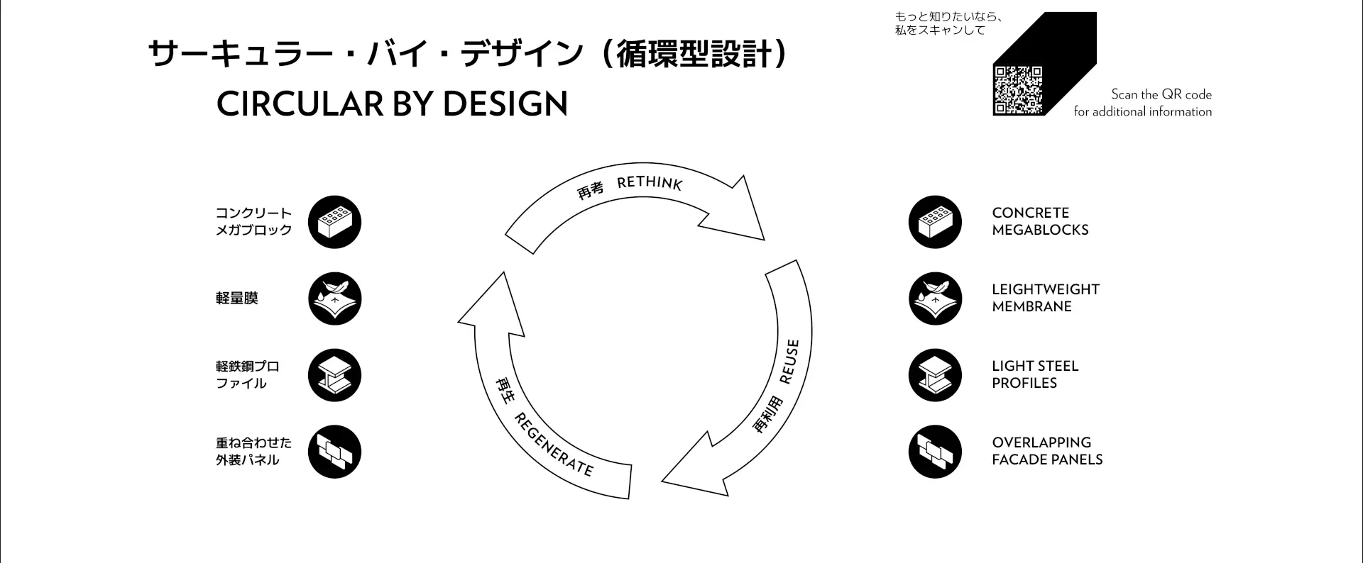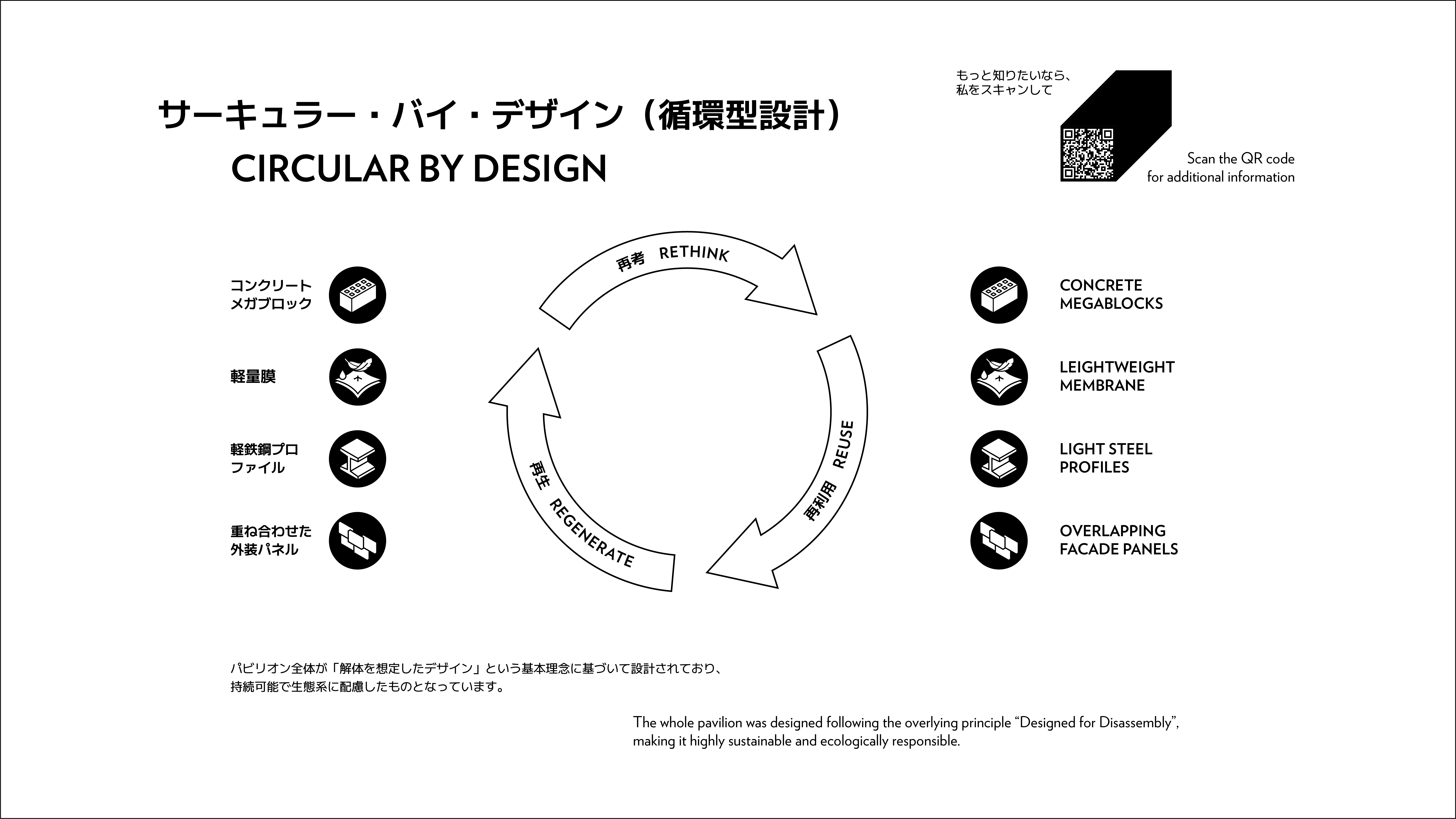 「サーキュラー・バイ・デザイン」は、日本語では「循環型設計」、あるいは「解体を前提としたデザイン」とも言い換えられます。循環経済の実現を目指し、ルクセンブルクパビリオンは設計段階から建物の解体および部材の再利用を見据えた計画がなされています。