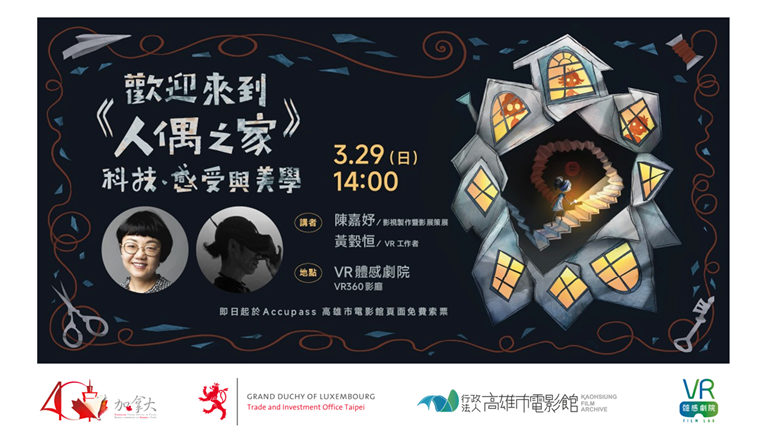 為讓更多朋友從不同角度認識這部作品的科技、感受與美學,盧森堡台北辦事處與加拿大駐台北貿易辦事處及高雄電影館共同舉辦主題講座,邀請到兩位專業的影視及VR工作者陳嘉妤及黃瑴恒從創作與製作兩個關鍵視角切入討論《歡迎來到人偶之家》